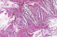 Gross Pathology: The lungs were swollen, dark red and heavy with serosanguinous fluid. Portions sunk in formalin. All other visceral organs appeared normal. Upon opening the calvarium, there were bilateral grayish yellow masses measuring up to 25mm adherent to both cerebral cortices. The right mass was smaller and distinctly indented the frontal cortex, while remaining entrapped in the dura. The left mass was not easily removed from the parenchyma and a third 10mm mass was found at the cerebello-pontine angle, mid-line between the occipital lobes. The texture of all masses was similar, firm and granular with softer foci of possible necrosis.