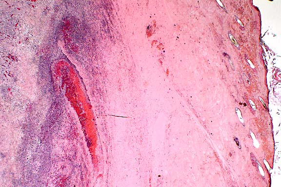 Gross Pathology: Large areas of skin necrosis and sloughing with exposure of bone were present on all distal limbs. Exudation and hemorrhages were also noted. Areas of indurated skin were located adjacent to the areas of skin necrosis.