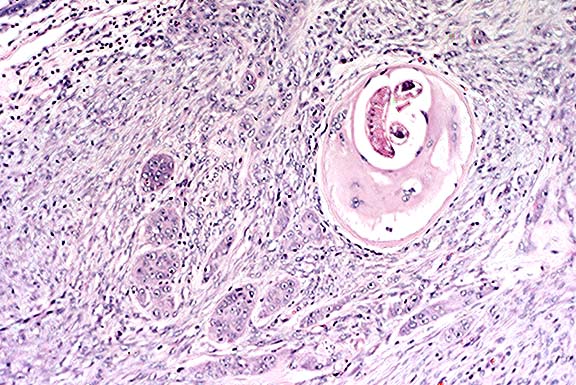 Histopathology: In the tissue sections from the oral cavity, there was invasion of the submucosa and connective tissues by a poorly encapsulated and densely cellular squamous cell carcinoma. Neoplastic cells formed small nests and cords that invaded the connective tissue, skeletal myofibers, and mandibular bone. The cells were large and polygonal with intercellular bridges and abundant well- demarcated eosinophilic cytoplasm. Nuclei were large and round with a stippled chromatin pattern and contained large, central, magenta nucleoli. There were 0-2 mitotic figures per high power field, with occasional bizarre mitotic forms. Occasional brightly eosinophilic keratin pearls were in the centers of the largest accumulations of neoplastic cells. Also within the larger foci of neoplastic cells, there were abundant cystic accumulations of necrotic debris which were occasionally admixed with small clusters of neutrophils. The mass was partly divided and surrounded by moderately desmoplastic stroma. There were numerous small blood vessels within the mass. Between the nests of cells there were numerous necrotic myofibers that were hypereosinophilic, swollen, and had lost cross-striations. At the periphery of the mass, necrotic mandibular bone was invaded by the neoplastic squamous cells. Additionally at the periphery of the mass, and occasionally surrounded by the neoplastic squamous cells, were multifocal intramysial nematode larvae identified as Trichinella sp. The larvae were 30-35 µm in diameter, coiled, and completely encapsulated within the myofibers or nurse cells. Affected myofibers were focally swollen to diameters of approximately 200 µm, which was estimated to be 2 to 8 times the diameter of the adjacent normal myofibers. The larvae were admixed with multiple myofiber nuclei and were suspended within flocculent amphophilic intracytoplasmic material in the nurse cells. The homogeneous capsules were 15-20 µm thick and were brightly eosinophilic, forming cysts around the larvae. Occasional infected myofibers were surrounded by small clusters of lymphocytes and plasma cells, with minimal numbers of eosinophils in the infiltrates. Within the neoplastic tissue, there were fewer encysted larvae than in myofibers at the tumor periphery. These larvae, in foci of necrotic debris, were occasionally degenerate, and small admixtures of neutrophils, macrophages and necrotic debris surrounded the larvae. Occasional similar intact larvae were within nurse cells within the skeletal muscle of the diaphragm. The multifocal hepatic lesions were determined to be benign cystic bile ductules.