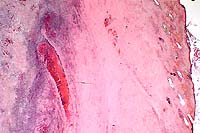Cutaneous vasculitis in horses is usually seen as a secondary manifestation of a variety of conditions, including infectious, toxic, neoplastic, and immunologic disorders. Cutaneous arteritis has been reported in a horse with granulomatous enteritis3. Most recognized syndromes of vasculitis in horses have characteristics similar to those of hypersensitivity-vasculitis seen in humans1, in which the most common inflammatory pattern is neutrophilic infiltration of venules in the dermis and subcutis. Usually there is leukocytoclasis, or neutrophil fragmentation with nuclear debris in and around vessels, and fibrinoid necrosis of vessel walls.