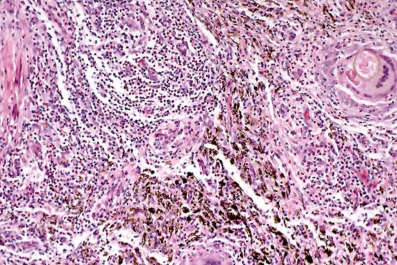 Histology: There is multifocal, nodular to bridging fibrosis of the portal areas with increased numbers of bile ducts and small, congested vessels. Within the fibrous stroma are multiple necrotic foci with large numbers of eosinophils, fibrin, cellular debris, mineral, and numerous oval eggs with a thick, light yellow wall that measure up to 90 x 140 :m in diameter. Many of the eggs are collapsed and defined by a partially disrupted wall that contains mineralized and proteinic globular material. The necrotic foci, eggs, and mineral are surrounded by multinucleated giant cells and epithelioid macrophages that blend into a peripheral zone of fibrovascular tissue with infiltrates of eosinophils, macrophages, plasma cells, lymphocytes and neutrophils. Interspersed with the inflammatory exudate and fibrous stroma is abundant, black granular pigment that is birefringent and yellow-orange with polarized light, consistent with fluke pigment (iron-porphyrin pigment). The surrounding portal areas have mild to moderate multifocal infiltrates of eosinophils, lymphocytes and plasma cells that are often associated with periductal fibrosis and transmigration of the inflammatory cells into the biliary lumina. There is multifocal necrosis and proliferation of plump hyperplastic biliary epithelial cells that surround small numbers of parasite eggs, epithelioid macrophages and multinucleated giant cells in the bile duct lumina.