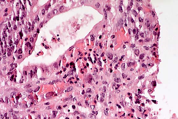 Gross lesions of EEE are uncommon, but may include edema and multifocal congestion and hemorrhage throughout the brain due to vascular lesions. Microscopic lesions predominate in the gray matter, particularly in the cerebral cortices, thalamus, and hypothalamus. The encephalitic reaction is primarily neutrophilic, with a gradual progression to nonsuppurative inflammation. In fulminating cases where the predominant inflammatory cell is the neutrophil, a characteristic feature is necrosis and fragmentation of the leukocytes. Necrotic neutrophils will occasionally surround degenerate or necrotic neurons. Vascular necrosis and thrombosis are present in some cases. Vasculitis was considered in this case due to the number of inflammatory cells present within vessel walls. However, vasculitis was not diagnosed due to the absence of both fibrin exudation and fibrinoid necrosis of the vessel walls. Due to the extensive neutrophilic infiltration of the surrounding neuropil, the presence of inflammatory cells within vessel walls is most likely due to leukocyte transmigration.