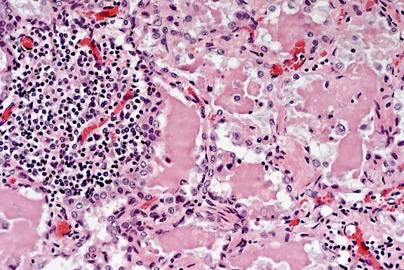 Gross Pathology: The goat was presented in good nutritional status and with mild postmortem autolysis. The lungs were diffusely firm; however, the cranial half of the lungs were firmer. The tracheobronchial tree contained a copious amount of white frothy fluid. Upon sectioning, a light tan, clear mucus oozed from the airways, and the parenchyma was mottled with innumerable, compact, 1-2 mm white foci. The right mammary gland was firm and congested throughout; no milk was noted in the gland. A whole blood sample taken from the right ventricle of the heart was submitted for serology.