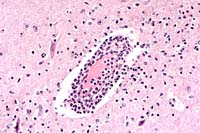 One section of cerebrum is present with a diffuse, mild to moderate perivascular accumulation of moderate numbers of neutrophils, lymphocytes, plasma cells, and macrophages (perivascular cuffing) with large numbers of neutrophils extending into the surrounding gray matter. Many neurons are in various stages of degeneration and necrosis and some of these are surrounded by dense aggregates of neutrophils and glial cells. There are widely scattered neutrophilic foci throughout the neuropil in the gray matter. The white matter is mildly infiltrated with similar cells, but the majority of the inflammation is contained within the gray matter. The meninges are diffusely infiltrated with small numbers of lymphocytes, plasma cells, neutrophils, and macrophages. Immunohistochemical staining with antibodies against eastern equine encephalomyelitis virus is positive, with the majority of staining in neurons.
