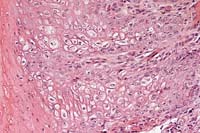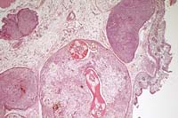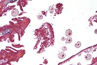 Gross Pathology: Four porcine animals were received. One animal was a 20 cm crown-to-rump length, moderately macerated fetus. A second animal was a 22 cm crown-to-rump length, mildly macerated fetus. The third animal was a 27 cm crown-to-rump length, fully haired, term, moderately autolyzed fetus. The remaining fourth animal was a live, fully developed, newborn piglet. The placentas of the three fetuses were also submitted and were severely autolyzed. All of the placentas contained abundant, creamy, opaque, white to yellow material. All four animals had numerous, 3 to 6 mm diameter, focal lesions, disseminated over the skin. The lesions had an elevated margin and depressed center. In the three fetuses, these foci were also covered with the same creamy, pale material found in the placentas. In the live piglet, the skin lesions were dry and scaly. The piglet also had elevated, red, circular lesions on the planum nasale and the palmar surface of the front claw.