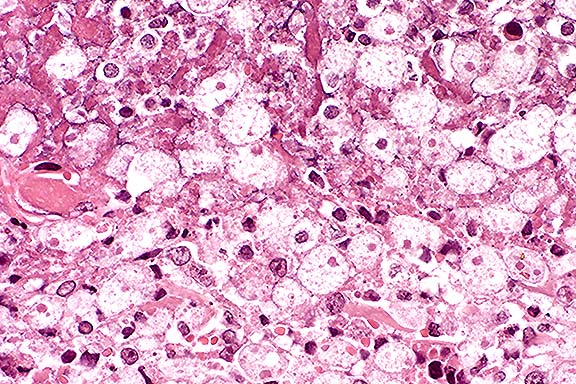 Laboratory Results: Serum chemistry at the time of death revealed elevations in total bilirubin (6.23mg/dl; normal 0.00-0.39mg/dl), alkaline phosphatase (22,630U/L; normal 0-704U/L), ALT (79U/L; normal 0-59U/L), AST (97U/L; normal 0-46U/L), and hypoalbuminemia (1.3g/dl; normal 3.3-4.7g/dl).