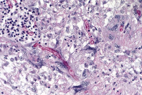 Conference Note: Conference participants discussed the morphologic differences between Aspergillus sp., common pathogens of birds, and Zygomycetes, which are occasionally seen in immunocompromised or debilitated birds. Aspergillus sp. hyphae are typically 3 to 6 mm wide, septate and branched. Branching is dichotomous and often at acute angles. Typical mucoraceous hyphae vary from 5 to 20 mm wide and branch nondichotomously at right angles. The hyphal walls are thin and often become twisted or folded.