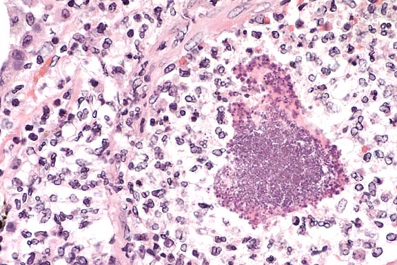 Staphylococcus aureus and Streptococcus pneumoniae are pathogenic cocci that cause pneumonia in primates. In contrast to the present case, S. pneumoniae usually appears as small diplococci and causes a fibrinohemorrhagic pneumonia, often accompanied by fibrinous pleuritis and pericarditis.