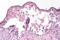 In contrast to the gross skin lesions, the microscopic lesions are relatively mild and include degeneration and necrosis of surface and adnexal epithelium and vesicle formation. Intranuclear viral inclusions are present in almost all affected epithelial foci. A mild variable neutrophilic infiltrate and multifocal subcuticular hemorrhage are present in the dermis of some affected sections. In sections with subcutaneous hemorrhage, small vessels are congested, lined by rounded endothelium and contain occasional fibrin aggregates. Some vessel walls are necrotic and rare endothelial cells contain intranuclear inclusions. Similar vascular lesions are present in the spleen.