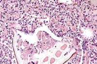 Conference Note: Conference participants discussed the importance of recognizing that two distinct processes are evident. One process is chronic, bronchocentric, and a result of foreign material introduced into the airways. The other process is more acute, angiocentric, and a result of staphylococcal bacteremia.