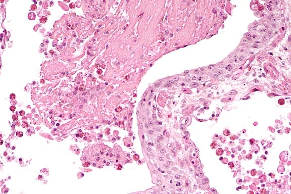 The caudal lung contained clots and strands of blood. Lung parenchyma