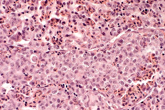 Gross Pathology: The nasal mucosa was thickened, red to brown and covered by fibrin. A single cerebrocortical infarct was observed on the external surface of the brain, with multiple additional 1-3 cm red to rust colored soft lesions found after incision. Larger pale fleshy lesions were observed in kidney and testes.