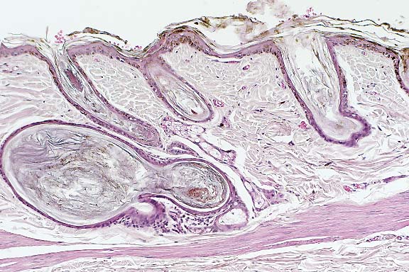 There is moderate to severe orthokeratotic hyperkeratosis, which extends into the follicular infundibulum with dilation of the follicular ostium. A few catagen and telogen follicles can still be found. The follicular papillum can be identified in abnormal locations, such as adjacent to the sebaceous ducts and at the base of follicles showing severe follicular dilation secondary to keratin accumulation. Some of the hairs are found at very unusual angles. Occasional melanophages are present in the dermis. The sebaceous glands and apocrine glands are within normal limits.