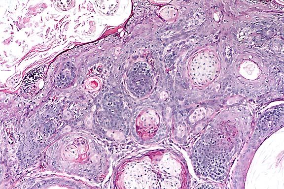 SCC in situ is considered to be rare in cats and very rare in dogs.2 Clinically, affected animals present with one or more erythematous, pigmented, nodular plaques which may be eroded or ulcerated. The plaques are well demarcated from the surrounding haired skin. Lesions may occasionally show local invasion or microinvasion, but metastasis has not been reported. Older cats are most often affected, and there is no known breed predilection.