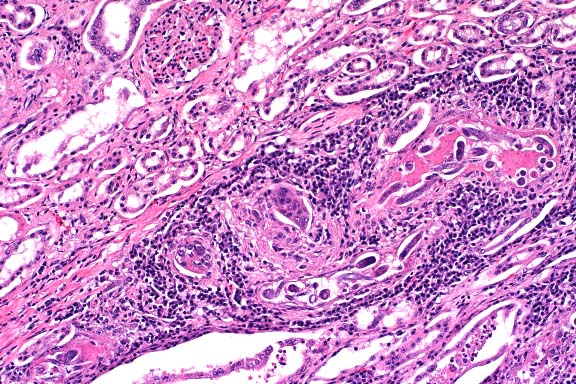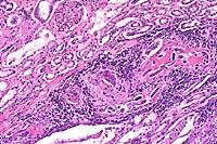 In addition to the brain, a similar necrotizing vasculitis was found in other sites including the lymph nodes, lung and colon. Perivascular regions were infiltrated with a population of inflammatory cells similar to those in the brain. Lymph node edema was prominent.