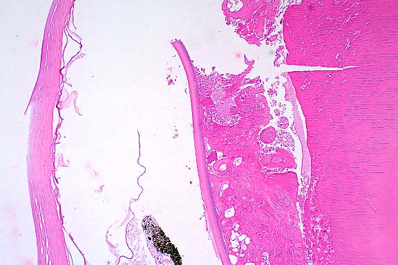 Because of its simple structure, physiology, and lack of vascularity, the morphologic changes that the lens can exhibit are primarily limited to: abnormal growth changes in the epithelium (epithelial hyperplasia and metaplasia); deterioration of the lens protein with coagulation and disorganization of the lens fibers (hydropic change; deposition of calcium salts or cholesterol); and rupture of the capsule which exposes the lens substance to external forces that may lead to liquefaction, organization, or dissolution. The precise mode of action of substances harmful to the lens is not always clear, but changes in the aqueous, which bathes and provides nutrition to the lens, probably precede any effects.