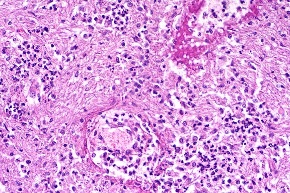and congestion. Within the centers of granulomatous foci, there