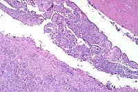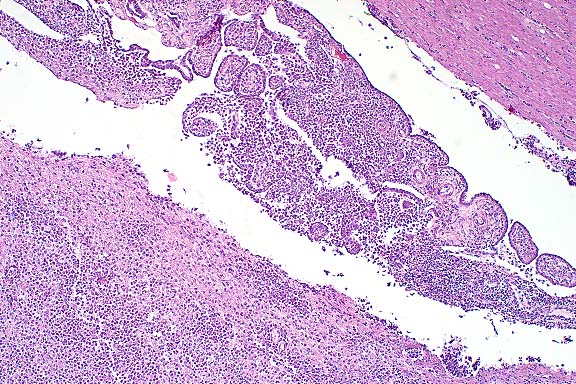 This slide demonstrates the characteristic features of RMSF. There is a necrotizing vasculitis with endothelial cell hypertrophy and a widespread perivascular and vascular infiltrate composed of neutrophils, macrophages, and lymphocytes. The vascular lesion is well demonstrated in the choroid plexus. Areas of malacia with gitter cells and large numbers of neutrophils are present.