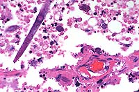 The pathogenesis, life-cycle, and route of infection of H. deletrix are poorly understood. The route of infection in humans seems to be from manure contaminated skin lacerations. Speculated routes of infection in the horse include: skin and mucous membrane penetration in recumbent animals by the free-living form of the parasite in the soil with subsequent invasion of the sinuses and bones of the head, and/or hematogenous spread to internal parenchymal tissues; prenatal or transmammary infection of suckling foals (there are reports of mammary gland infection with facultative rhabditid nematodes) (Buergelt CD, 1991). The two cases presented here are of interest for two reasons in particular: these are the first cases in which H. deletrix was identified in urine or sperm; these two horses were located geographically near each other, and both died within a two-month time frame. While more research is needed, the potential for a urinary or reproductive route of infection may also exist.