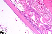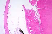 Eye, composite description: Within multiple lenses, there is focal to segmental, subcapsular, laminar fragmentation and liquefaction of the fibers and replacement by variably sized, irregular, coalescing, vacuoles which contain finely granular to globular, eosinophilic deposits. In more severely affected eyes, virtually the entire lens is affected with clefts and protein lakes dispersed throughout the fibers. In multiple lenses, there are solitary to confluent bladder cells. Immediately below the capsule in approximately half the fish, there is focal to focally extensive epithelial degeneration and necrosis with attendant hyperplasia and rare, fibrous metaplasia.