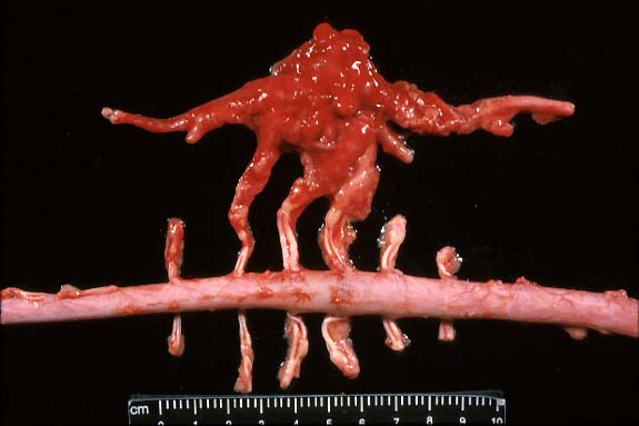 cord there is a hemorrhagic, multinodular mass (5x9cm) attached