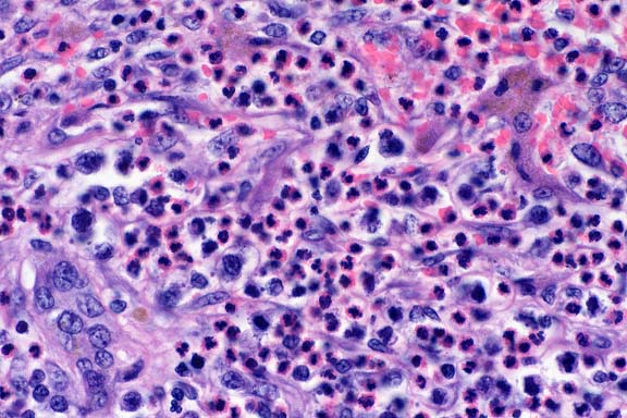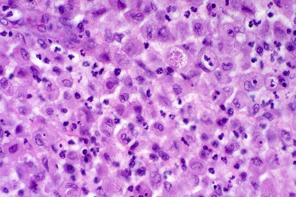 of eosinophilic cytoplasm and hyperchromatic nuclei that are
