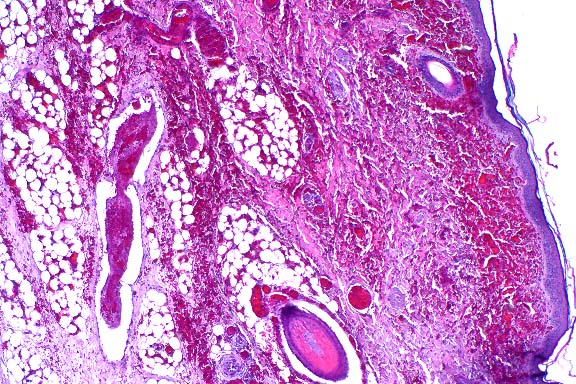 - 1. Haired skin, dermis and subcutis: Thrombosis, fibrinoid