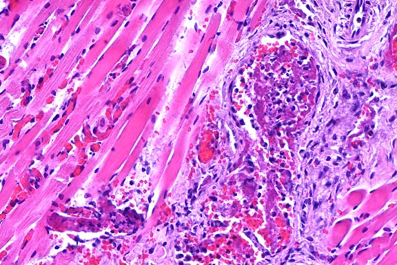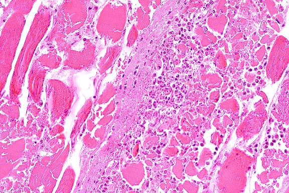 - 1. Moderate necrosuppurative myositis with fibrinoid necrosis