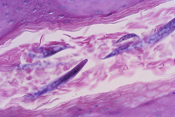 view has cross-sections of 3 nematodes within a hair follicle.