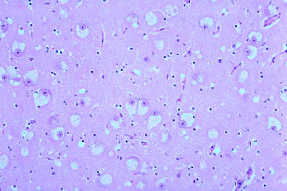 of necrosis, with vacuolation of the neuropil, and gliosis; endothelial