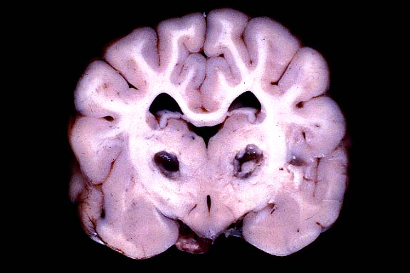 The principal lesion in this brain is subacute bilaterally symmetrical