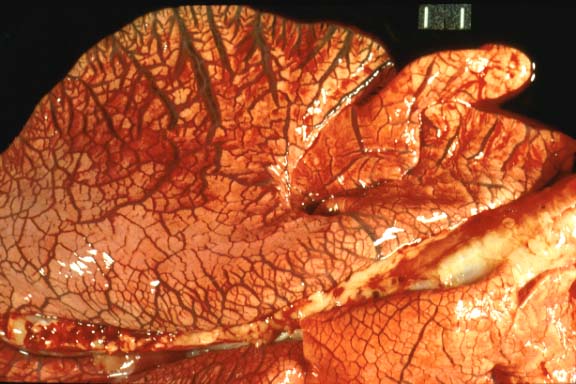 The upper left lung lobe was severely consolidated, mottled pink,