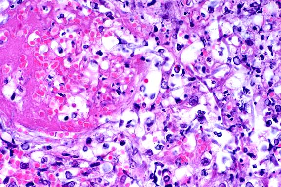 by inflammatory cells. There is multifocal perivascular hemorrhage.