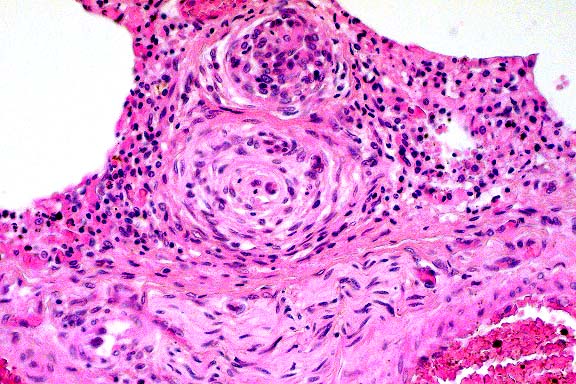 occludes vessel lumens. Occasionally, the hyperplastic endothelium