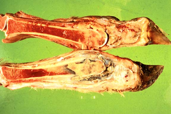 Fibrinopurulent exudate was present in the interphalangeal joints