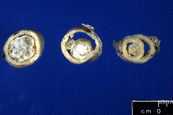 ranging from 0.5 cm to 2 cm in diameter (gross photo of cross-sectioned,