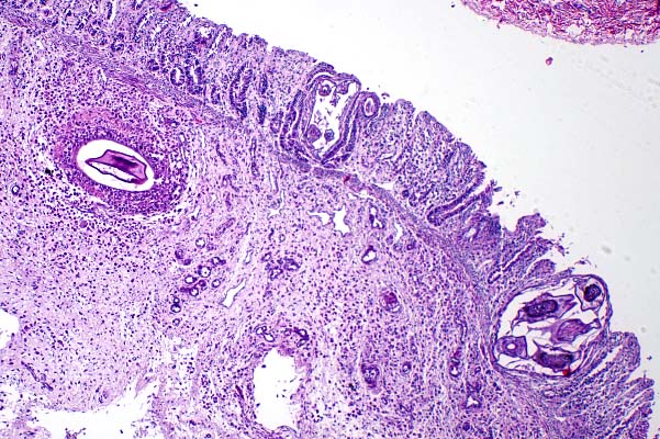 colitis with sections of nematode larvae in the lamina propria