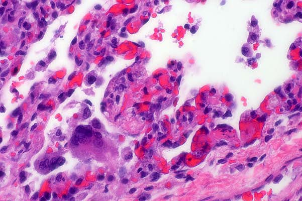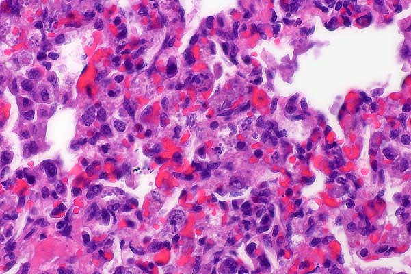 and cell debris within alveoli and alveolar septa. Scattered