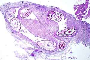 Abundant reddish-brown foci represent embedded nematode (Cyathostome)