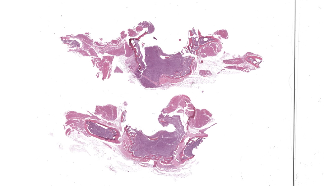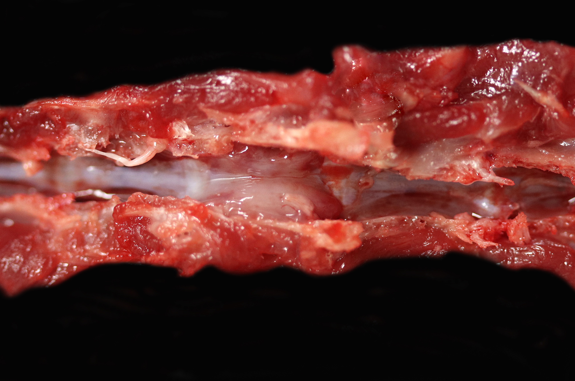 Associated with the vertebral body and the ventral aspects of the pedicles of T11 and protruding into the vertebral canal was a 0.6 cm long, soft, light purple grey, bilobed mass that surrounded and compressed the local segment of spinal cord. With examination of the external surface, an approximately 1.4 cm long segment of the regional spinal cord was streaked white, red, and dark red (hemorrhages). After formalin fixation and decalcification, the T11-L1 vertebrae was sectioned serially. The cut surfaces of the T11 vertebral body and portions of the pedicles were expanded and replaced by a poorly demarcated, soft, shiny, white tissue inconsistently mantled by an irregular brown rim that filled the medullary cavity with loss of the trabecular architecture. The regional cortical bone was irregular and multifocally thinned.