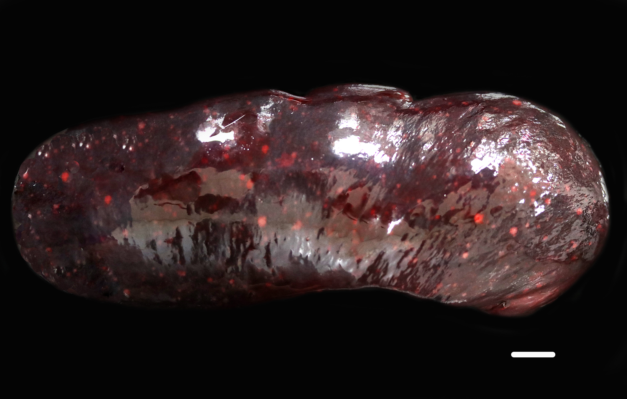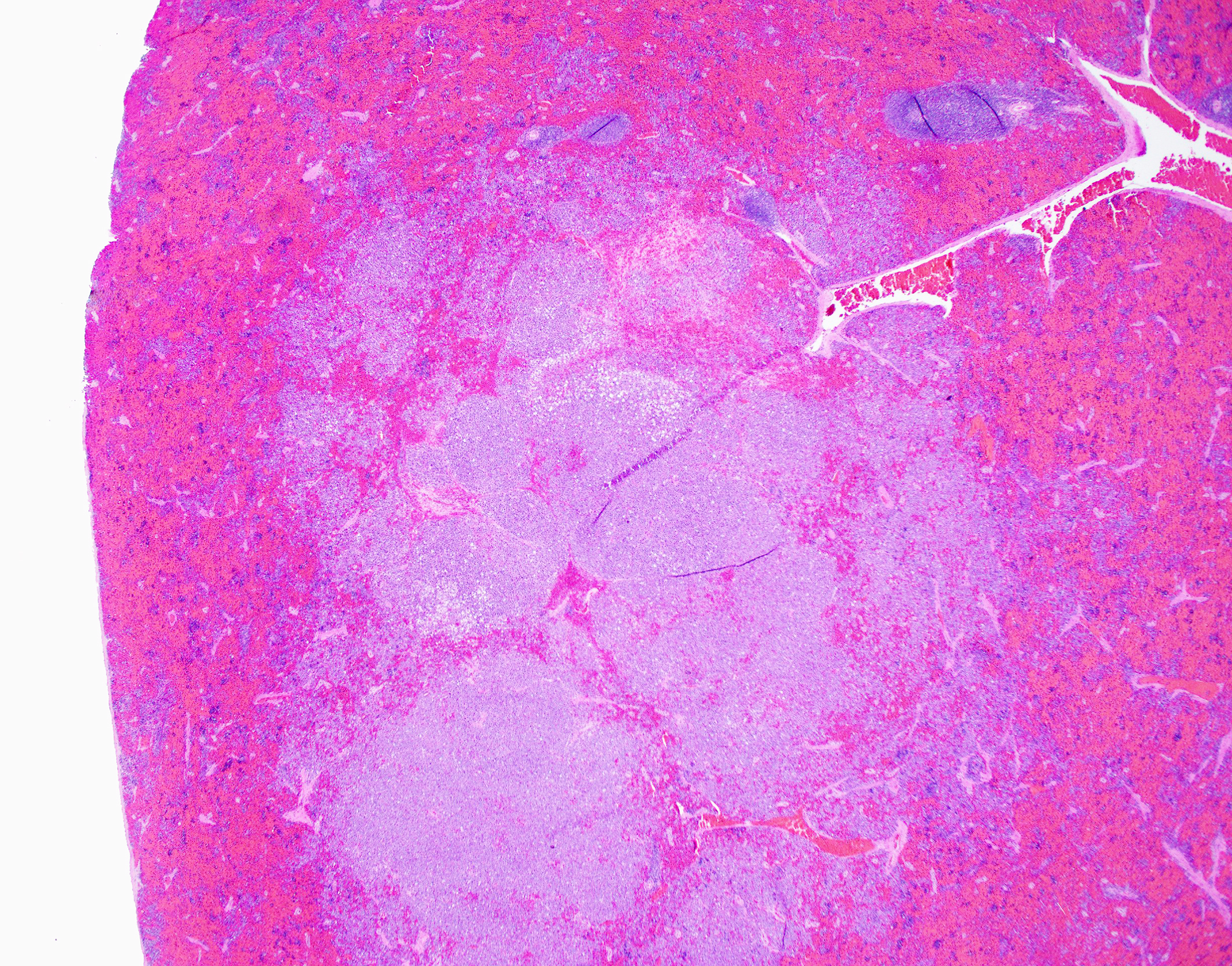In addition, the spleen was severely enlarged (95.6 g; 6.8% of the body weight) with dozens of randomly distributed sharply demarcated, pinpoint to 0.6 cm in diameter, oval to spherical, soft, white foci and nodules.