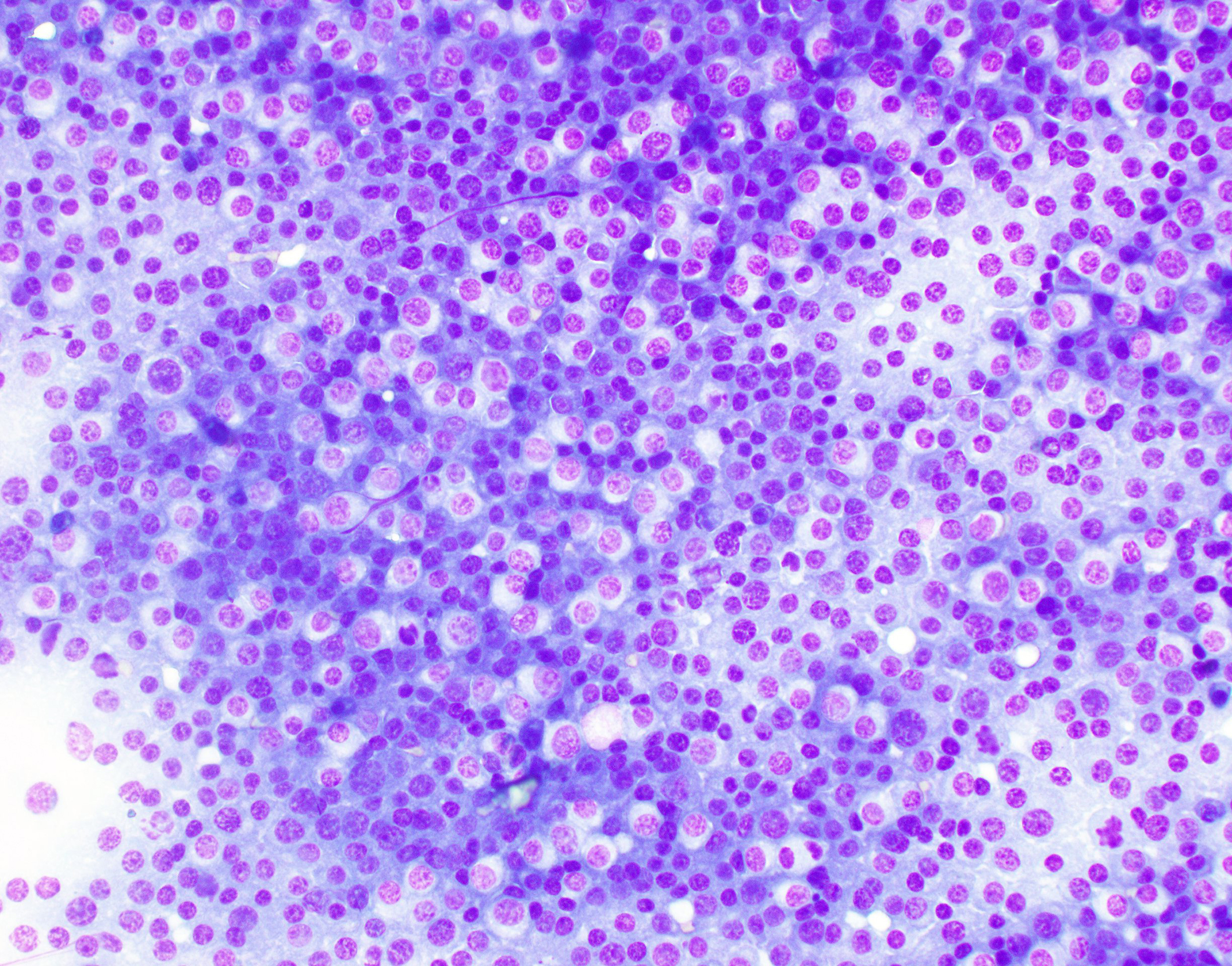 Vertebral foramen mass Touch imprints of the surface of the T11 vertebral canal mass are composed of sheets of markedly pleomorphic neoplastic round cells. Round cells have moderate to large amounts of deep to pale blue cytoplasm with variable nuclear-to-cytoplasmic ratio. These cells typically contain a single, eccentrically marked cellular and nuclear pleomorphism. There are rare atypical mitotic figures.