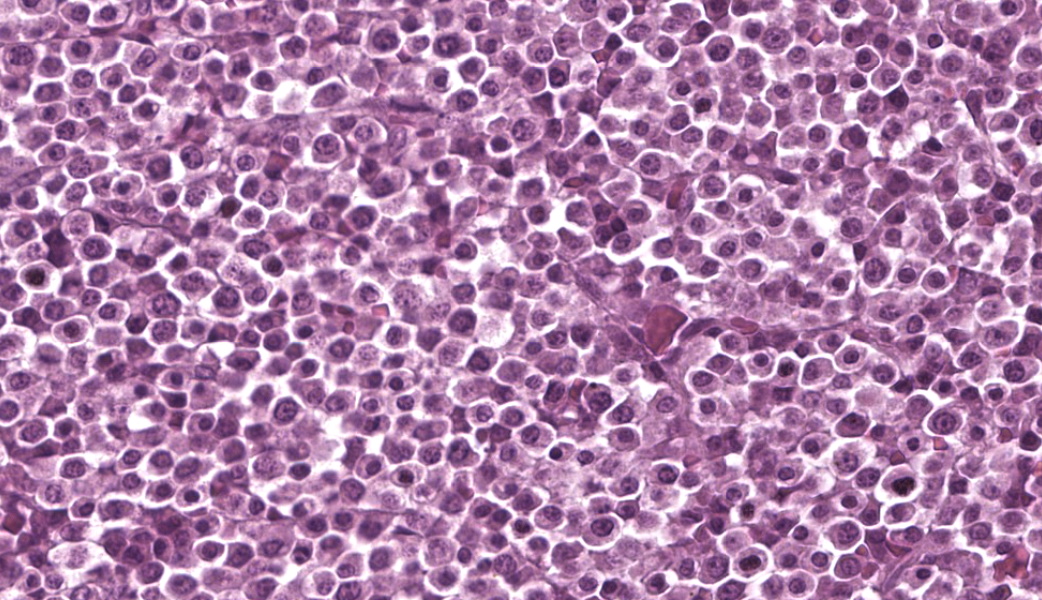 Participants immediately recognized a round cell neoplasm replacing the vertebral marrow cavity. Because participants had only the H&E slide to review prior to conference, and because the neoplastic cells displayed atypia without uniformly classic plasma cell morphology, conference goers agreed that they could not definitively diagnose a plasma cell tumor from the slide alone. As such, the JPC elected to diagnose a lymphoma, which is reflected in the morphologic diagnosis. This decision also reflects the fact that, in addition to the morphology of the neoplastic round cells, lymphoma is the most common hematopoietic neoplasm, as the most common malignancy in ferrets (islet cell tumors, which rarely metastasize in this species, notwithstanding). However, when the full clinical, gross, and laboratory context was revealed, including vertebral osteolysis, splenic involvement, monoclonal gammopathy, classic cytologic findings, and systemic plasma cell proliferation, the case aligned well with multiple myeloma as the final diagnosis. This contrast between what can be stated from the H&E slide alone and what can be concluded from a more comprehensive data set provided an excellent teaching moment on the importance of a full diagnostic work-up in cases such as this.