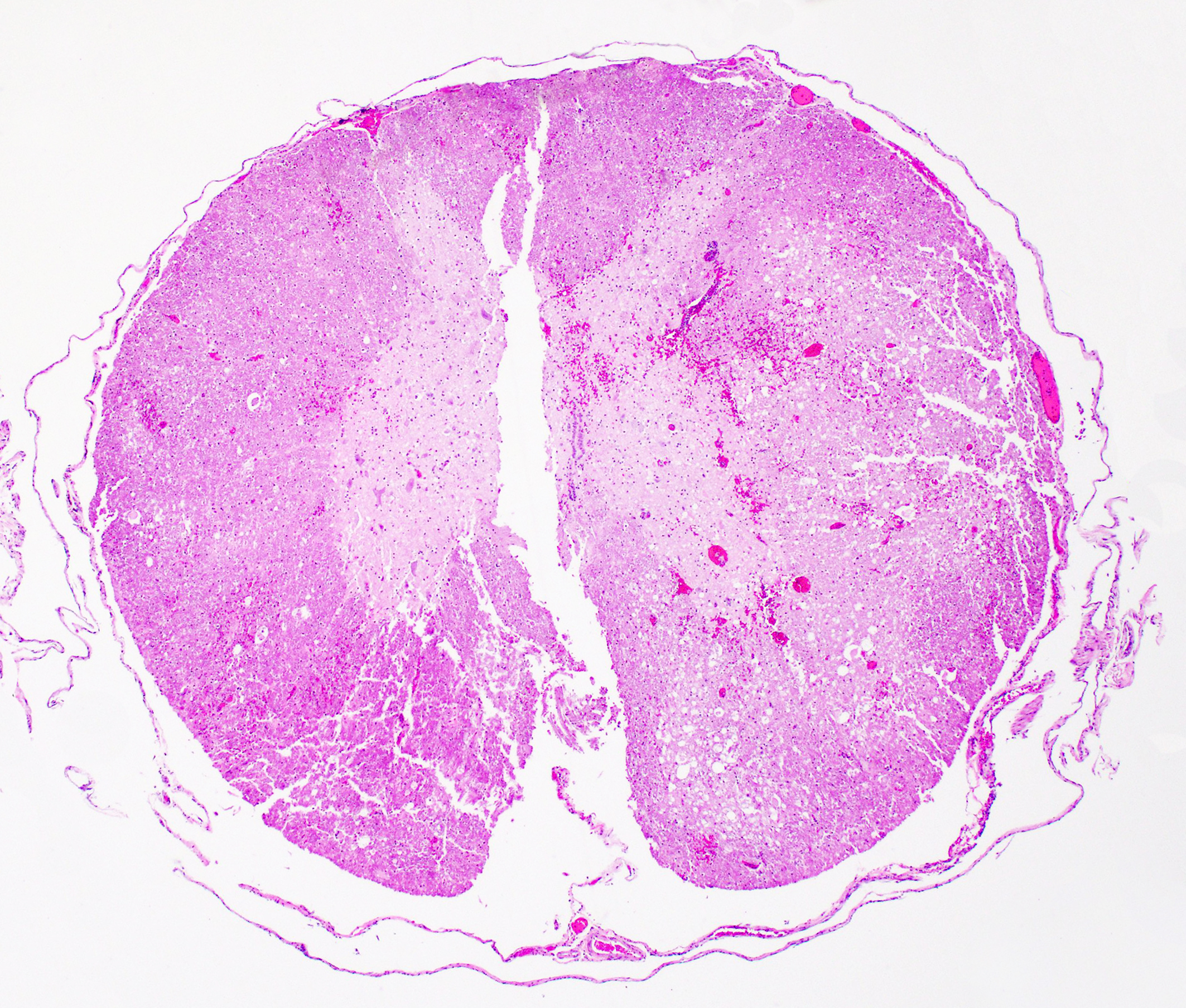 - Axonal degeneration, multifocal to coalescing (ventral and lateral funiculi), severe with markedly dilated myelin sheaths, multifocal intravacuolar fragmented myelin and macrophages (ellipsoids/digestion chambers); multifocal swollen axons (spheroids); and marked reactive glial cells [compression myelopathy]