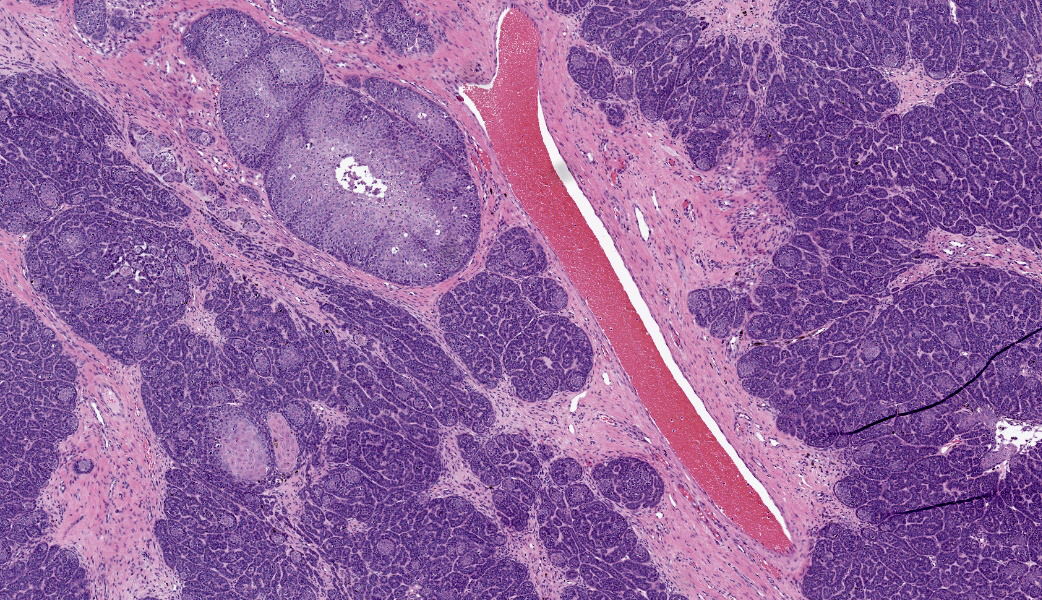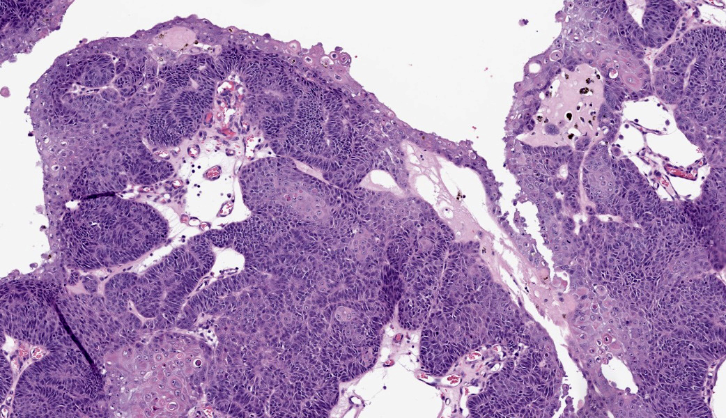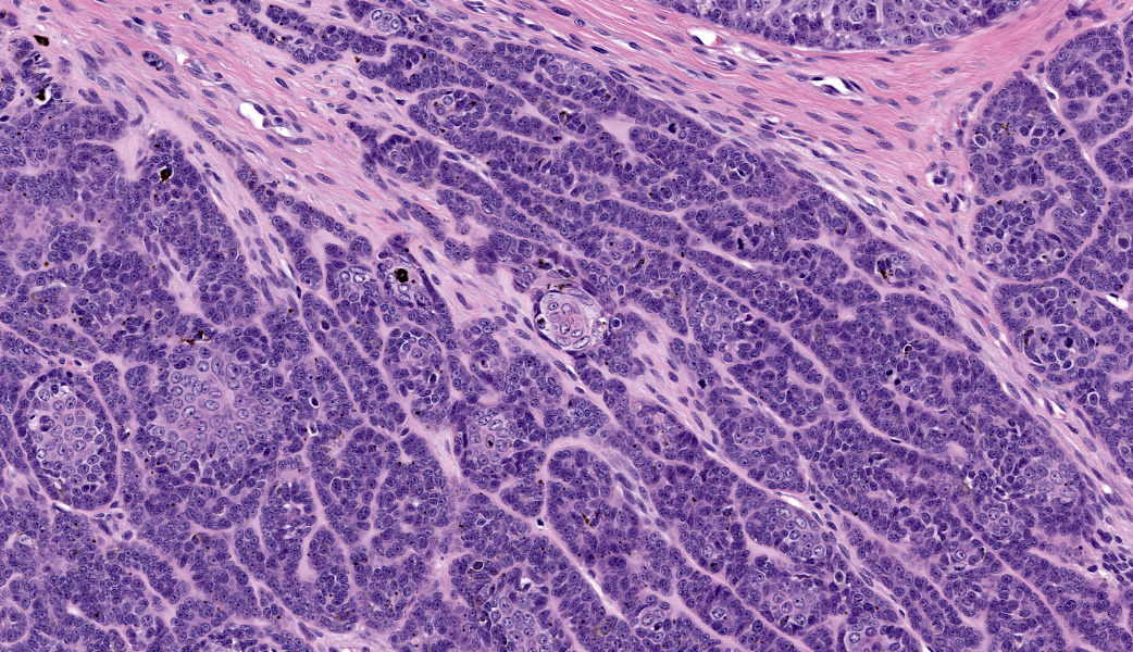 Haired skin: Extending from the dermis deep into the subcutis is an approximately 2 x 2 cm well-demarcated cystic mass lined by neoplastic undifferentiated basaloid epithelial cells. The neoplastic cells are arranged in lobules of dense anastomosing and palisading cords or small tightly packed nests, supported by scant fibrovascular stroma. There are multifocal papillary projections of neoplastic lobules into the lumen of the large cystic cavity. Multifocai lobules have smaller central cyst formation. The neoplastic basaloid cells are cuboidal with scant basophilic cytoplasm and round to oval, hyperchromatic nuclei, with two or more prominent nucleoli. There is minimal anisocytosis and moderate anisokaryosis. There is multifocal abrupt squamous differentiation and necrosis and approximately 5 mitotic figures per high power field. Brown granular pigment, most consistent with melanin, is present throughout the periphery of the mass; multifocal melanomacrophages infiltrate neoplastic lobules. Neoplastic cells extend to within 2 mm of the surgical margin; however, there are multifocal foci suspicious for local invasion.Contributor's Morphologic Diagnoses: