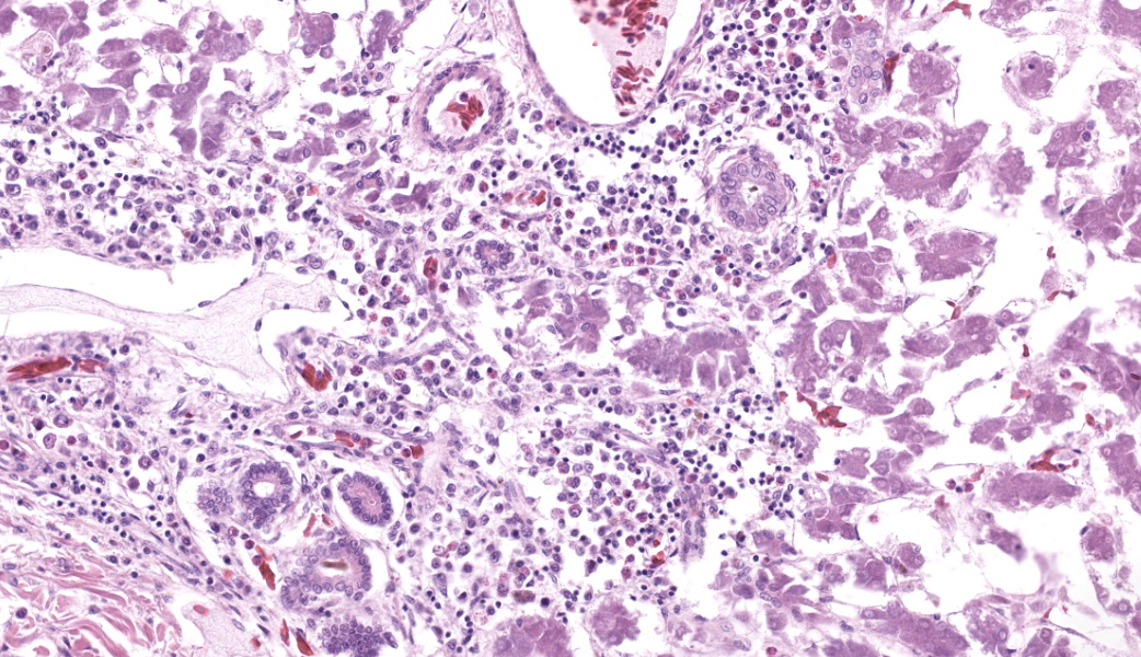 The University of Pennsylvania’s Dr. Nathan Helgert moderated this year’s 11th conference. This is his first time moderating for the WSC, and participants thoroughly enjoyed his quick wit and engaged teaching style. He chose to focus on poultry and ruminant pathology, which participants are always grateful for. This first case was a classic entity with fantastic histologic lesions that, according to some conference goers, provided the perfect moment to make use of the term “geographic” to describe those dramatic areas of necrosis. They truly resemble some beautiful cartography.Conference discussion focused on the diagnostic approach to cases like this one where additional diagnostics are required to “suss out” the etiologic agent. Participants were asked to take a figurative step back and develop a list of possible causes of bacterial sepsis in chickens that could lead to hepatic and splenic lesions like these. The list included E. coli (colibacillosis), Salmonella typhimurium, Staphylococcus aureus, Enterococcus spp, Streptococcus spp.,Erysipelothrix rhusiopathiae (although this is more likely in turkeys and pheasants than in chickens), Mycobacterium spp (especially M. avium), and Pasteurella multocida, to name just a few. Some of these look nearly identical to one another both grossly and histologically, while others of these have more distinct features. Either way, culture and special stains will be needed.