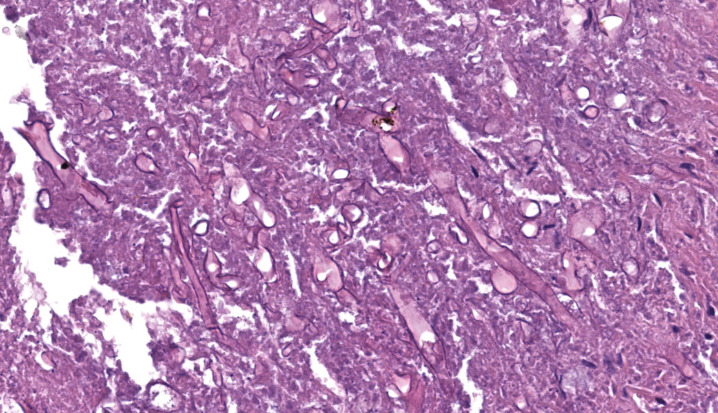 This case represents a florid case of intestinal pythiosis. The etiologic agent of pythiosis in mammals is Pythium insidiosum, which causes cutaneous, intestinal, and occasionally upper respiratory infections in a wide variety of species. P. insidiosum is an aquatic oomycete (clade Stramenopila/ heterokonts, class Oomycetes, order Pythiales, family Pythiaceae), with many of its closest relatives being plant pathogens that are the cause of what is colloquially known as “root rot”. Pythium spp. are closer relatives to algae than fungi, and care should be taken to not miscategorize these organisms into the kingdom Fungi.These water molds, unsurprisingly, preferentially grow in aquatic, warm environments. The preferable temperature range for growth ranges from 34 to 36C (93 to 97F) but growth is still possible in temperatures up to 45C (113F).2 Historically, the distribution of this organism has been limited to tropical and subtropical environments, and in recent years (starting in 2003) increasing numbers of cases have been reported in higher latitude regions, such as Northern California and the Chincoteague national wildlife refuge in Virginia.1,5,6 Speculation about the cause for the expansion in the geographic range of this organism includes the adoption of environmental modifications such as rice field flooding in Northern California.1