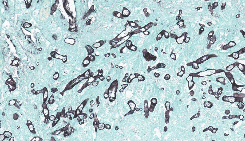 This was a truly phenomenal case of pythiosis and conference participants felt spoiled with how visible the hyphae and zoospores were on the slide. Oomycetes usually are much more challenging to find and tend to appear as “hyphal ghosts” from The Great Beyond, only visible with use of special paranormal photography...or a GMS stain. A classic entity, the contributor of this case provided an exceptional write-up on Pythium insidiosum and other major differentials in this case.Conference discussion largely focused on a review of oomycete characteristics, most of which were covered by the contributor, as well as a few interesting facts about them that were not in the contributor’s write-up. For one, infective Pythium insidiosum zoospores display chemotaxis towards animal hairs, intestinal mucosa, and wounded tissue. How neat is that? Pythium is also equipped with some impressive virulence factors that enable it to cause death and destruction regardless of it ends up in the intestinal tract or in the skin. Its cell wall components include cellulose and β-1,3-glucan. Beta-glucan, in particular, can be a target for host immune cells. 3.10 Despite these being literal components of its own cell wall, Pythium comes equipped with a glucan 1,3-beta glucosidase, which breaks down β-1,3-glucan. While that may seem a bit counterintuitive, glucan 1,3-beta glucosidase acts as a virulence factor for Pythium by breaking down β-1,3-glucan from the cell wall, allowing the pathogen to dampen the host’s immune responses and enable it to invade tissues.3,10 This enzyme is identified as an “immunodominant” protein and is upregulated by Pythium during infection, suggesting it plays a key role in both disease progression and in triggering host immunity.10
