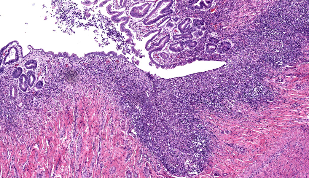 - Duodenum: Duodenitis, ulcerative, subacute, multifocal, moderate.