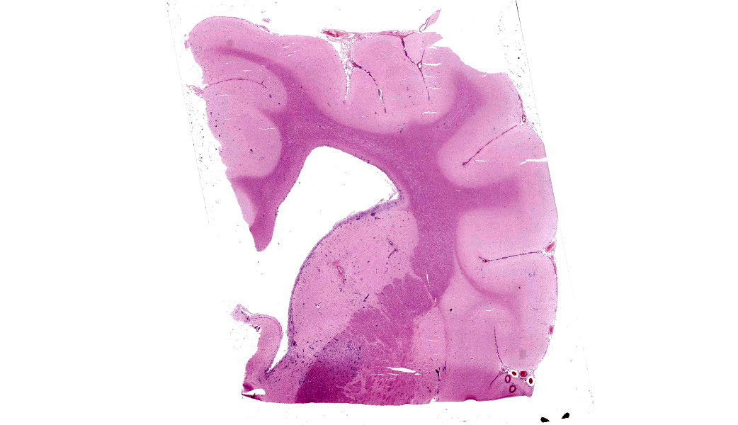 History of weight loss despite appetite and diarrhea. Animal became neurologic and blind for approximately one week until developing seizures. No reported bloodwork abnormalities (complete blood count, blood serum chemistry, and bile acids). Dog was euthanized and submitted for necropsy.